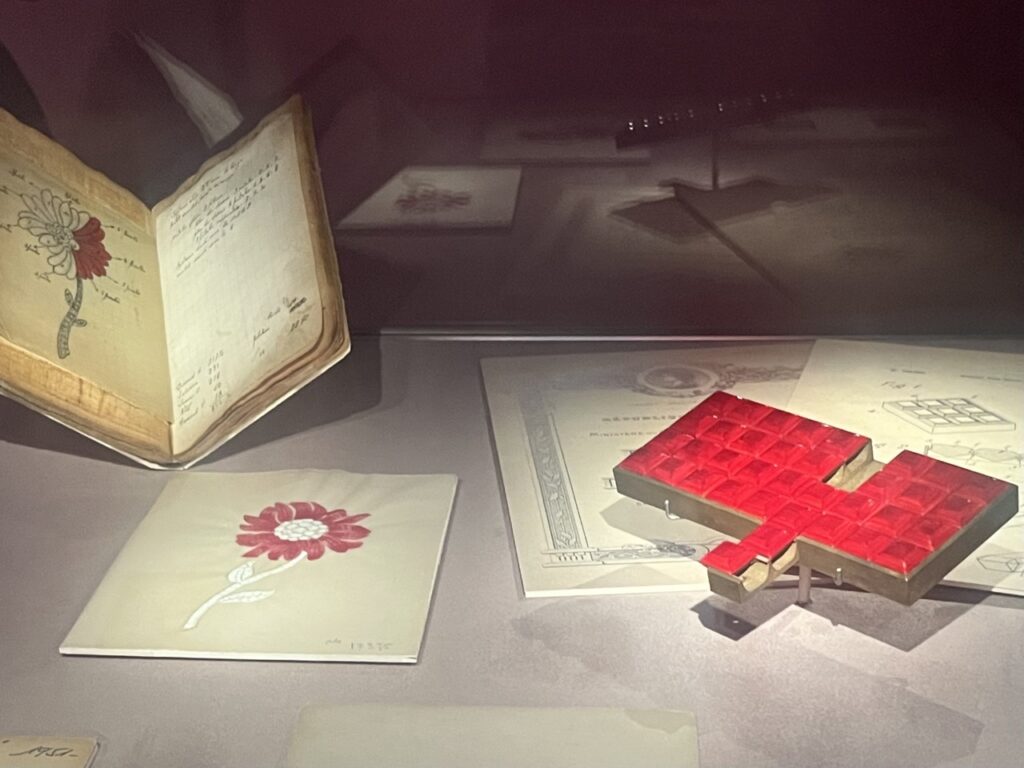 ここで興味深かったのは、単なる展示品ではなく、製作過程を可視化する要素が取り入れられている点でした。例えば、エナメル技法、ミステリーセッティング、宝石彫刻、変形構造、金細工技術、設計スケッチ、顧客向け見本などが並んでおり、ジュエリー制作の「裏側」を垣間見せる展示になっていました。