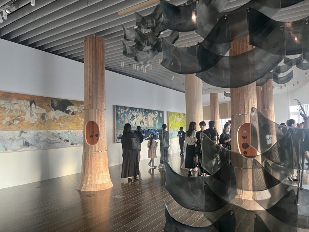 幅広い表現手法が導入されており、現代アート作品、テキスタイル表現、立体造形、インスタレーション、コラージュ、映像、陶芸、屏風や提灯など、伝統工芸との接点を意識した作品が混在しています。