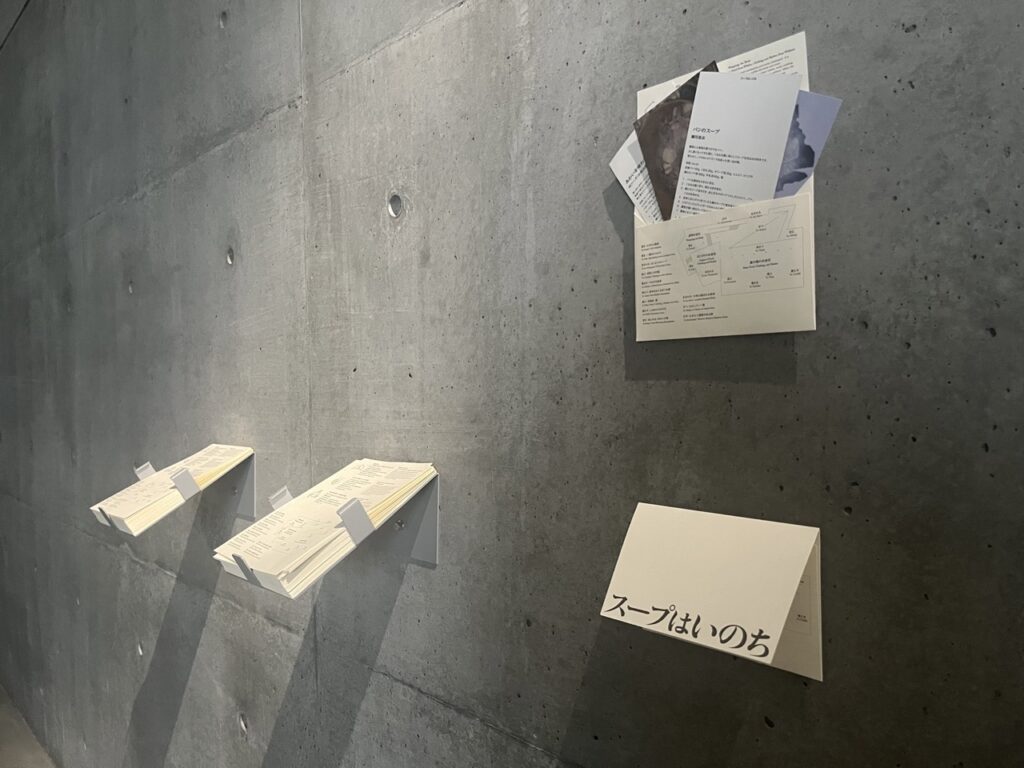 展示入口には、会場の地図が記された封筒が用意され、来場者はそれを手に取り作品を巡ります。本展覧会に参加する料理家等が拵えた、展示作品に対応するスープのレシピカードを、手紙のように封筒に収め持ち帰ることで、鑑賞後も「つくる」や「味わう」へとスープをめぐる物語が続いていきます。