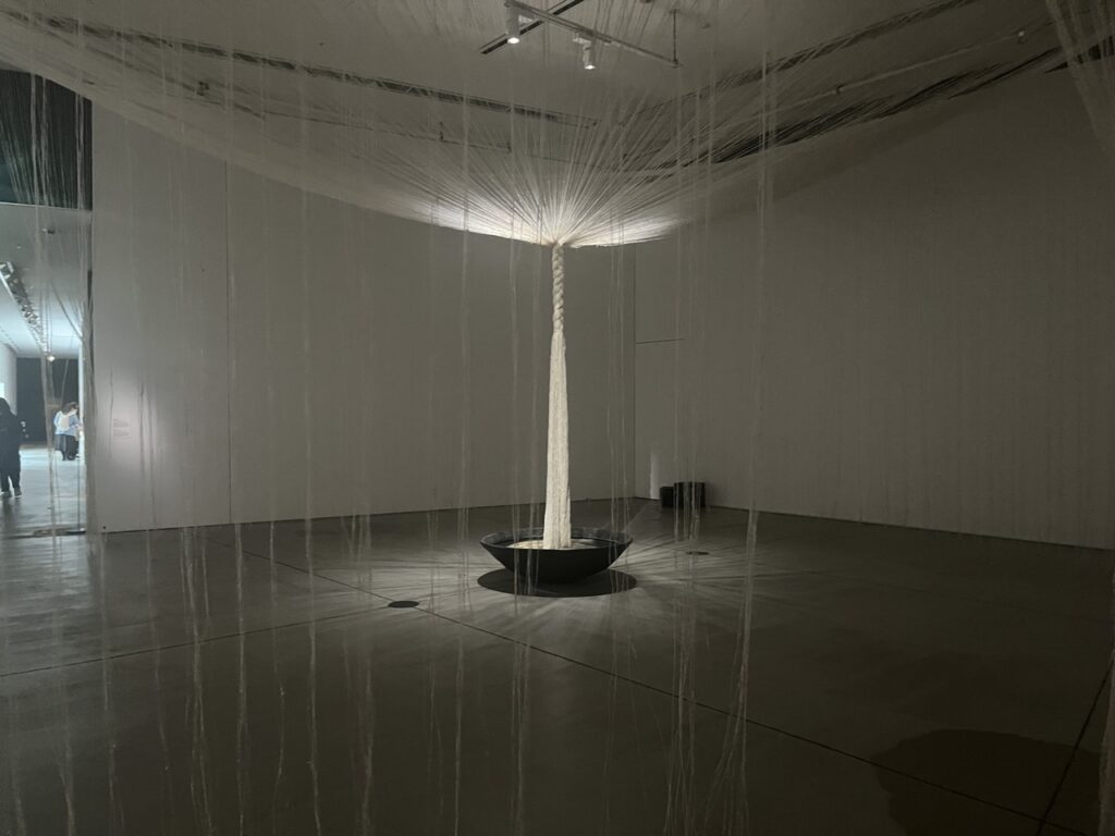 ギャラリー1に出現する作品「はじまりのスープ」では、空間の中心に羊水と同じ0.9%の塩分濃度を再現した水を湛えた器を据え、そこに蚕が吐き出す生命を守る繭の最初の線である「緒糸」を垂らします。