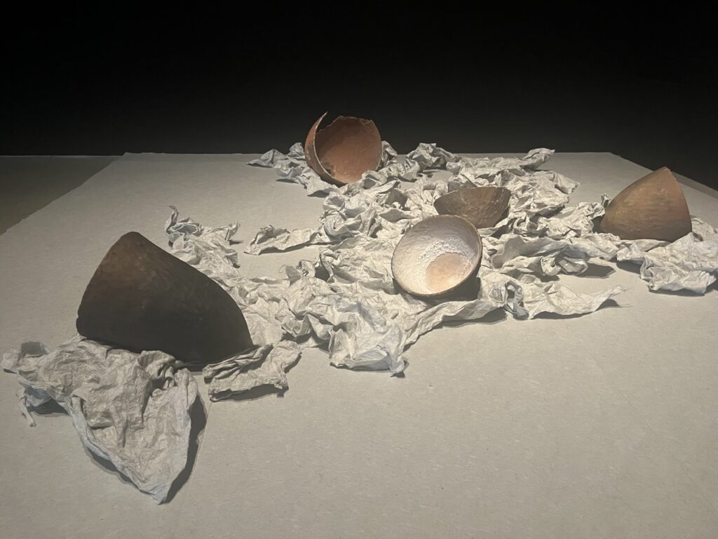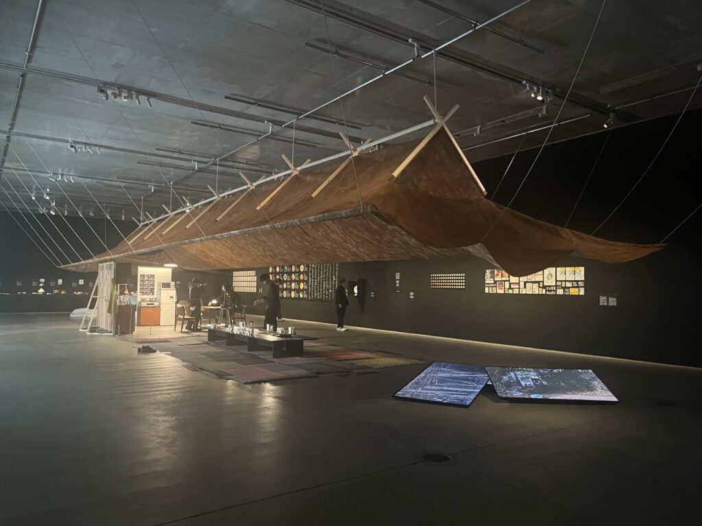 会場内には、和紙に土を混ぜ込んだ「土紙」でつくられた屋根が出現し空間を大きく包み込みます。この屋根の下では、太古から火とともに営まれてきた「煮炊き」の原風景や台所で「遊ぶ」作品など、時代を超えた衣食住の営みを感じることができます。